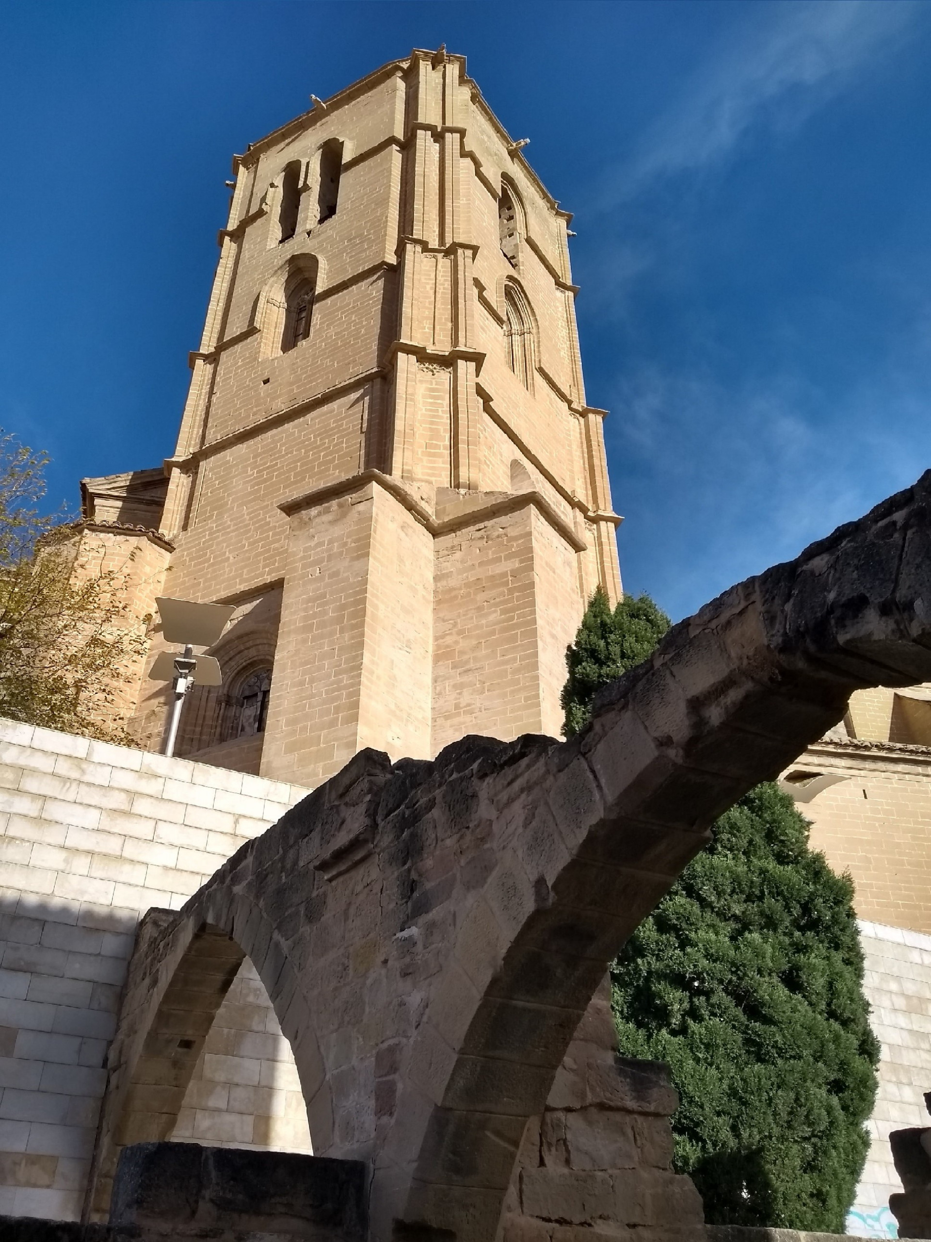 Esta torre campanario es el único vestigio que queda del antiguo templo gótico que se levantaba en parte del solar que hoy ocupa la fábrica barroca de la iglesia de Santa María la mayor. Su construcción se inició en el siglo XIV, pero fue interrumpida por la peste negra de 1348, de manera que no fue concluida hasta bien entrado el siglo XV.