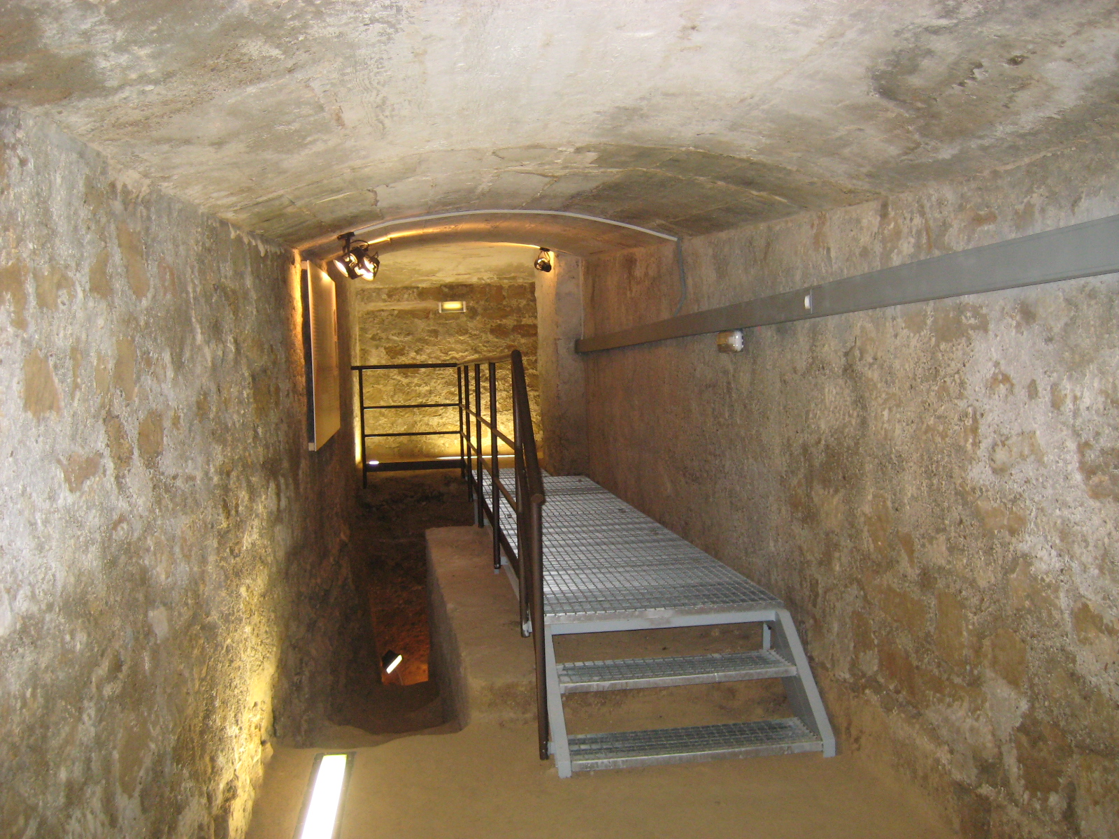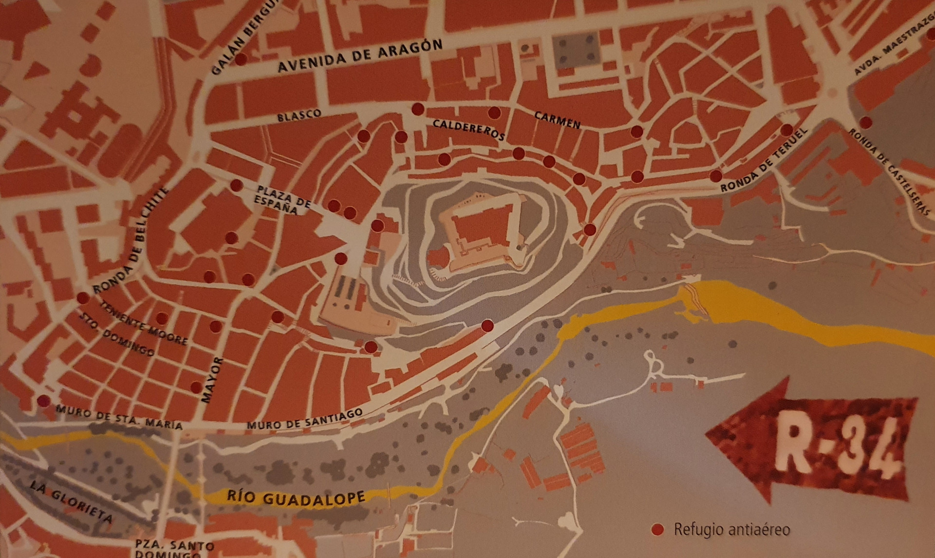En el interior del refugio, durante las obras de acondicionamiento para su musealización, se descubrieron los cimientos de uno de los torreones que formaban parte del último recinto amurallado de la ciudad del siglo XIV.