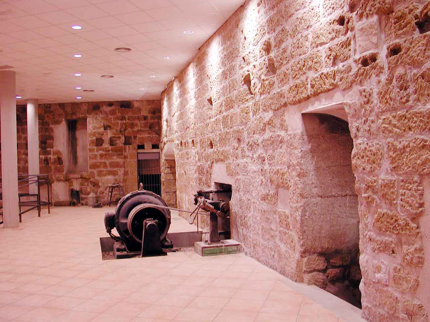 En la planta inferior se conserva en parte el edificio del antiguo molino. Uno de los más antiguos de España en su género, y también uno de los más grandes de su época, ya que contaba con cinco muelas en la sala abovedada antes citada, y dos más subsidiarias en el torreón hexagonal defensivo donde se almacenaba el trigo. En esta misma planta, se encuentra la sede del Taller de Arqueología de Alcañiz, responsable del hallazgo, la catalogación y la reconstrucción de la mayoría de piezas expuestas arriba.